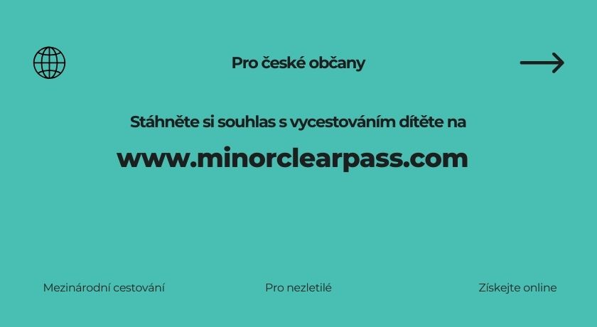 Souhlas s vycestováním dítěte vydává mezinárodní MinorClearPass.com v angličtině. Dokument je použitelný pro všechny destinace po celém světě a vystavuje se pro každé dítě samostatně. Vyřízení probíhá online a dokument vám bude zaslán na e-mailovou adresu.